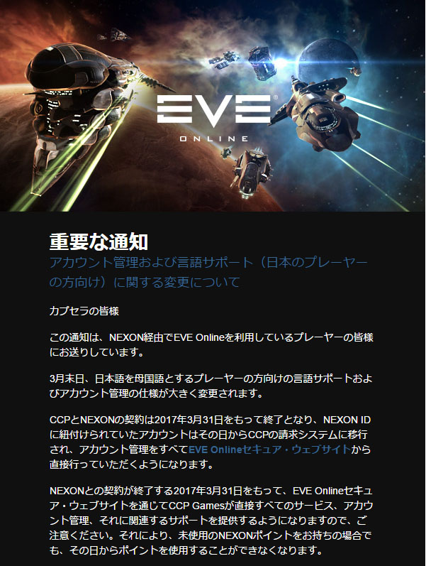 EVE 2017/03/04 ネクソン終了を祝って乾杯 ありがとう、そして永遠にさようなら。この記念すべき日を祝い、香辛料の効いたワインで乾杯しよう。 【公式フォーラム】重要な通知 - アカウント管理および言語サポート(日本のプレーヤーの方向け)に関する変更について・3行まとめCCPとネクソンとの契約が2017/03/31に終了。それに伴い、クライアントの日本語化も終了。日本向けのカスタマーサポートや日本語のウェブサイト、サポートの日本語化は引き続き行われる。【私の見解】日本語化終了は残念ですが、ネクソンとの契約が断たれるのは喜ばしいです。「日本語化あり+ネクソンあり」の現状でも日本人プレイヤーはそんなに増えていないので、「日本語化無し+ネクソン無し」のほうがメリットが大きいかな。と思いました。もし有志による翻訳が可能なら、それはとても素晴らしい事だと思います。【余談】ネクソンが過去にやらかした企画(の顛末)EVE Onlineの未来に幸あれ。 PR