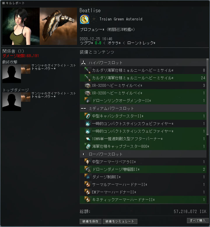 イベント 2021/03/02 復帰しました+FFAイベント結果報告 お久しぶりです。Beatliseです。4年ぶりに復帰しました(*'ω'*) で、T1FG FFA Eventの結果はこちら。 20勝 66敗 9引き分け 92位 でした! 100位以内だったので豪華景品も頂きました。【キルボ】 ・Ships:166Kill, 101Loss・ISK :1.60b-Kill, 586.40m-Loss・Solo Kill:12隻憎っくきブリ―チャーをカウンターFitでフルボッコにしてたら、逆カウンターFitされてフルボッコにされたり。ブラスターFitの4人が間合いを取ったまま12分間にらみ合いが続き、引き分けになるかと思いきや残り3分で乱戦が始まり、ギリギリ生き残って勝利して崩壊3秒前に脱出成功したり。膠着状態に陥って戦況が進まない中、"あいつら倒すの手伝ってくれないか?"と外人からコッソリ個人チャットが来たり。共闘して他の2人を共同撃墜したら、"良い動きだ!友よ!"とかなんとか褒められて、"オーケー、それじゃあ準備は良いか?"―――okay, come on.その後、彼と1対1の戦いになり、ギリギリの勝利を収め、"GF、いい試合だった。よければFitを見せてくれないか?"―――ありがとう、君も強かったぜ。Fitはこれ。"凄いな、どうりで硬かったわけだ。ランキング狙ってるのか?"―――あはは!とそんな感じで戦場で奇妙な友情が芽生えたり。久しぶりに素敵なゲーム体験をさせて頂きました(*´ω`*)***あと他にも、復帰後すぐ、リハビリがてらに冬イベントに参加したら愛用の巡洋戦艦がスクラップになったり T1-Abyss楽勝だからってT3-Abyss突入したら死にそうになったり トリグ領に観光しに行ったらドリフターに殺されたり 最上位スリーパーサイトに挑んでストラティオスが轟沈したり ※機雷源ワンチャン耐えられるかなと思いきや即死でした(;'∀')とまぁたのしいEVEライフを送ってます……敗北は失敗ではない。挑戦しない事が失敗なのだ。あと、ジタ-アマー間の航路が変わってて衝撃を受けました。 商材輸送してたらオーメンに2回撃たれてトルネードからロックされました。APしてたら死んでたぜ。ぴえん。 PR