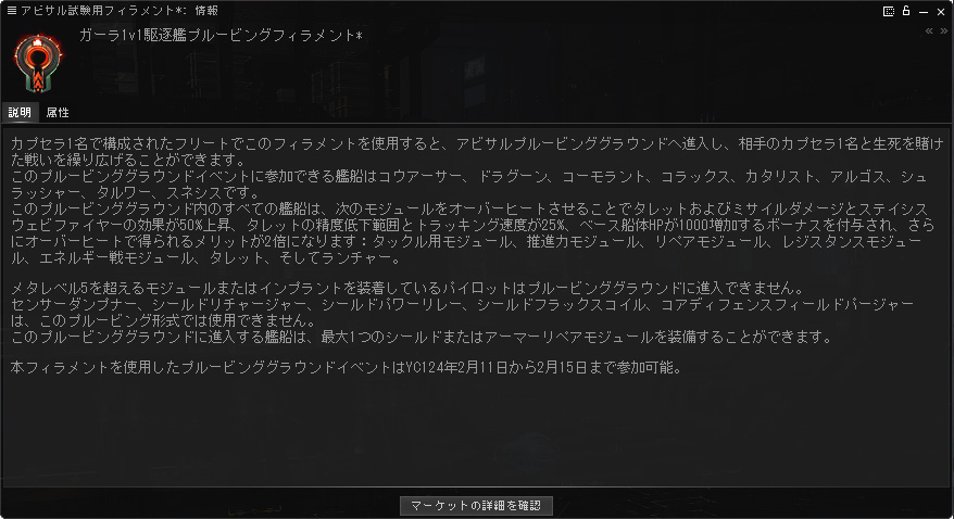 カプセラ1名で構成されたフリートでこのフィラメントを使用すると、アビサルプルービンググラウンドへ進入し、相手のカプセラ1名と生死を賭けた戦いを繰り広げることができます。このプルービンググラウンドイベントに参加できる艦船はコウアーサー、ドラグーン、コーモラント、コラックス、カタリスト、アルゴス、シュラッシャー、タルワー、スネシスです。