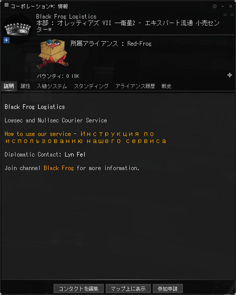 インダストリー 2016/08/21 Black Frog Logisticsを利用してみた Black Frog Logisticsを利用してLowSecからの搬出を行ったときの事を備忘録のように書きます。 ◆"Red-Frog"EVE最大の輸送業アライアンス。HighSec輸送専門の"Red Frog Freight"と、LowSec/NullSec輸送専門の"Black Frog Logistics"があります。コントラを請け負うコーポと、実際に輸送を行うキャラクターは別会社に配置しているなど、戦争対策も成されています。今回はLowSecからの搬出なので、"Black Frog Logistics"社のサービスを利用します。 つづきはこちら PR