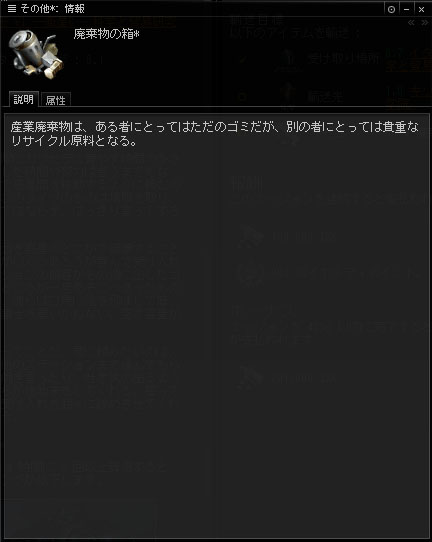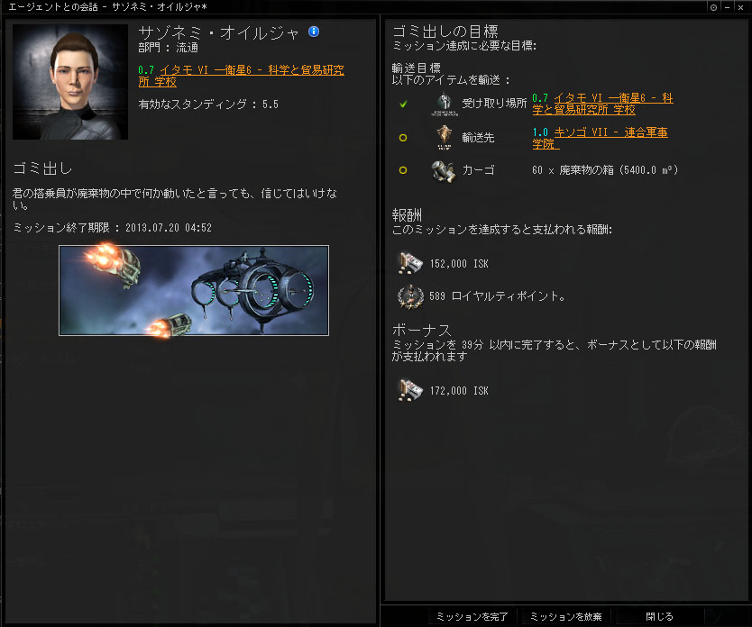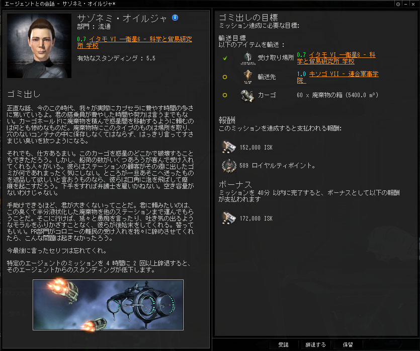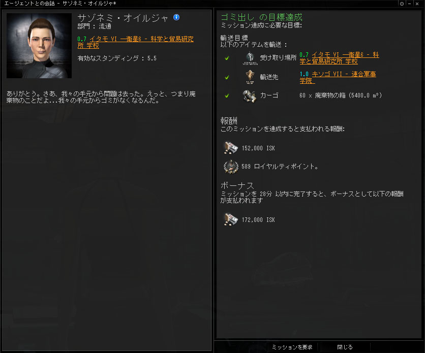 インダストリー 2014/01/30 本当は怖い輸送ミッション うん、今日は輸送ミッションなんだ。やることはとても簡単。エージェントからアイテムを受け取って、別のステーションに運ぶだけ。実入りは少ないけど、手軽にできて回数を回せるのが魅力。ISKよりも、もっぱらスタンディング上げのために回されることの多いミッションです。…で、ええと、何を運ぶんでしたっけ。え?ゴミ出し?ヘ( ゚Д゚)ノ ゴミ出し正直な話、今のこの時代、我々が実際にカプセラに費やす時間の多さに驚いているよ。君の搭乗員が費やした時間や努力は言うまでもない。カーゴホールドに廃棄物を積んで惑星間を移動するように頼むのは何とも惨めなものだ。廃棄物特にこのタイプのものは場所を取り、穴のないコンテナの中に保存しなくてはならず、はっきり言ってすさまじい臭いを放つようになる。 それでも、仕方あるまい。このカーゴを惑星のどこかで破壊することもできただろう。しかし、船荷の数がいくつあろうが喜んで受け入れてくれる人々がいる。彼らはステーションの顧客がその週に出したゴミが何であれまったく気にしない。ところが一旦あそこへ送ったものを返品して欲しいと言おうものなら、彼らは口角に泡を飛ばして癇癪を起こすだろう。下手をすれば弁護士を雇いかねない。空き容量がないわけじゃない。 手助けできるほど、君が大きくないってことだ。君に頼みたいのは、この臭くて半分液状化した廃棄物を他のステーションまで運んでもらうことだ。そこに行けば、延々と愚痴を言ったり、吐き気の出るようなモラルをふりかざすことなく、彼らが後始末をしてくれる。誓ってもいい。PR部門がコロニーの難民の受け入れを我々に辞めさせてくれたら、こんな問題は起きなかったろう。 今最後に言ったセリフは忘れてくれ。 …お、おう?(^ω^;)なんだかよく分からないが、ステーションの中の人も大変なんだなー(棒とりあえず受諾……っと。 君の搭乗員が廃棄物の中で何か動いたと言っても、信じてはいけない。 えっ……?_(⌒(_'ω' )_動い…た……?ゴミだよね…?動くの…?ゴミなんだよね…? えっと…、その……、運んでいいんですよね…?―――数ジャンプ後…はい、運んできましたー。あっ、ハイ、こちらのカーゴになります。どうz――― ありがとう。さあ、我々の手元から問題は去った。えっと、つまり廃棄物のことだよ...我々の手元からゴミがなくなるんだ。 ………。………。………。ねぇっ!!何なの!?何を運ばせたの!?:(;゙゚'ω゚'):あれ本当にゴミだったの!??動いてたんだよ!!?中身なんだったの!?ねぇってば!! ―――"ゴミ"はリサイクルのため、再処理施設へと送られた。そして、私の手元には、幾許かのISKと、LPと、スタンディングが与えられた。運び出したゴミとは一体何だったのか。何故、ゴミが動いていたのか。今となっては、誰も知る術は無い。……そういえば、あるカプセラがこんな事を言っていた。 「此処はニューエデン、死体も大事な資源になるんですよ」そうだ…、我々のようなクローン体の原料は…バイオマス……。そして……確か……バイオマスの原料となるのは…………………。………。………。いや、これ以上考えるのはやめよう…。あれは、ゴミだったんだ。私はただ、ゴミ出しをしただけなんだ。うん、そうに違いない。そういう事にしよう……。 PR