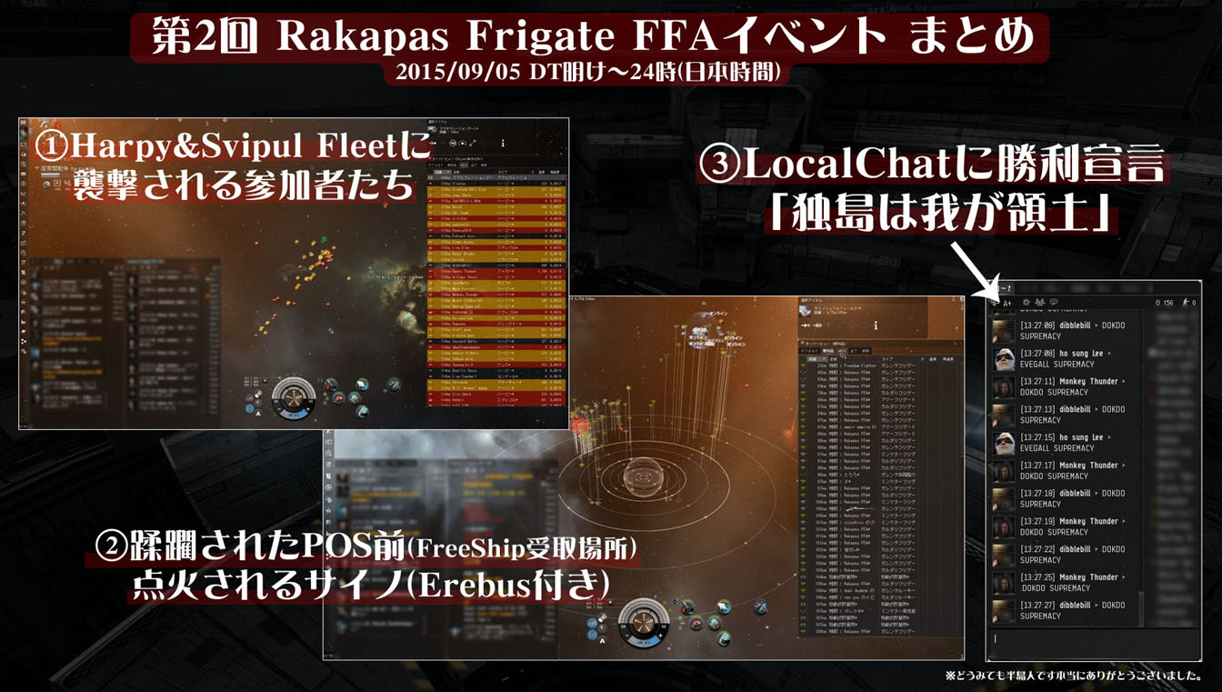 PVP 2015/09/06 第2回FFAイベントに行ってきたよ ①Harpy&Svipul Fleetに襲撃され、参加者たちが虐殺される。②POS前(FreeShip受取場所)を蹂躙されてサイノ点火される(後ほどErebusがやってくる)③LocalChatに埋め尽くされる勝利宣言「DOKDO SUPREMACY」(訳「独島は我が領土」)※どうみても半島人です本当にありがとうございました。 Lowで開催されるイベントだから、こういったルール無視の襲撃リスクがあるのは当然なのですが…。何よりも残念だったのは、面食らった参加者たちが「我、関せず」という態度になってしまい、対抗フリートを立てようという声が挙がらなかった事だと思いました。正直言えば、私も開始15分の時点で「JCジャンプしてインカージョンでもやりに行こうかなぁ…」と諦観にふけっていましたが、やられっぱなしは悔しいので何か対抗できる方法は無いかな…と思い、とりあえずステルス艦で偵察を行い、敵性の数・艦種等を調べたりしてました。(もし私が主催者だったら、イベントの正常進行は不可能と判断し、対抗フリートを設立してあいつらぶっ殺そうぜイベントに急遽変更してたかも知れません)とはいえ、残念ながら私はPVPフリート戦には詳しくないので良い対抗策が思いつかなかったのですが…。Link付けて全員でPOS前で各個迎撃するとか…?(´・ω・`)なお、録画した動画を見直したところ、敵性の編成は以下の構成でした。(ワープアウト直後のOVをスクロールして数えただけなので、多少誤差はあるかもしれません)◆敵性Korean -KIMUCHI- Fleet構成スヴィプル:18ハーピー:52ジャックドー:2クロー:1タラニス:1ケレス:1ジャガー:3サイス:1連邦海軍仕様コメット:1バースト:1うわ、すげぇ数:(;゙゚'ω゚'): ラカパスのSTにはFit済みのT1FG:26隻、FacFG:5隻、T2FG:6隻、T1DD:5隻があったので、もし対抗フリート設立の際には船の供出も頭の片隅で考えていました。…え?そんな戦力じゃ足らないって?…アッハイ。 「イベントをぶち壊しにされた!」「楽しくなくなってしまった」「ルール守るのなんて日本人だけでしょ」そうですね。その通りですね。つらい。とてもつらいです。でも、ちょっと待って下さい。そこで思考停止せず、もう一歩考えてみることは出来ないでしょうか。事実、あの状況でもPOS砲台で何隻かの敵性をKillすることは出来ていたようですし、完全撃退とはいかなくとも、連中に一矢報いて "GF" と言わせるだけの抵抗は出来たかもしれません。……出来なかったかも知れないけど。 ともあれ、片や、徒党を組んで対抗するわけでもなく嵐が過ぎ去るまで沈黙を続ける日本人。片や、規約違反(※1)を犯してまで自らのナショナリズムをアピールする韓国人。たかがゲームの中とはいえ、いつもの両国の特性が垣間見えた一幕でした。※1)ゲーム内でリアルの政治的発言はNG。同様に宗教・人種差別・RMTの話題もNG。 PR