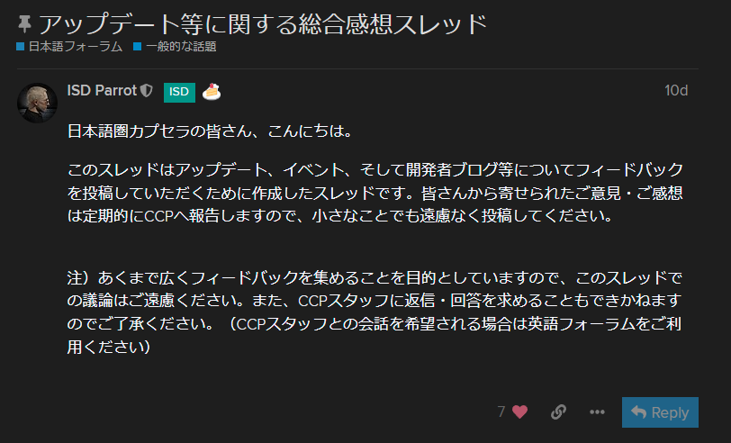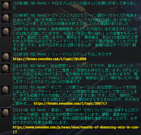 EVE 2022/06/22 アプデのフィードバックスレに投稿しました ISD Parrotから「感想やご意見があったら投稿してね!あと日本語訳おかしかったら報告してね!」と告知がありましたので、私も色々ご意見投稿してみました。 アップデート等に関する総合感想スレッド https://forums.eveonline.com/t/topic/366747/ 日本語ローカライズ – フィードバックスレッド https://forums.eveonline.com/t/topic/284080 つづきはこちら