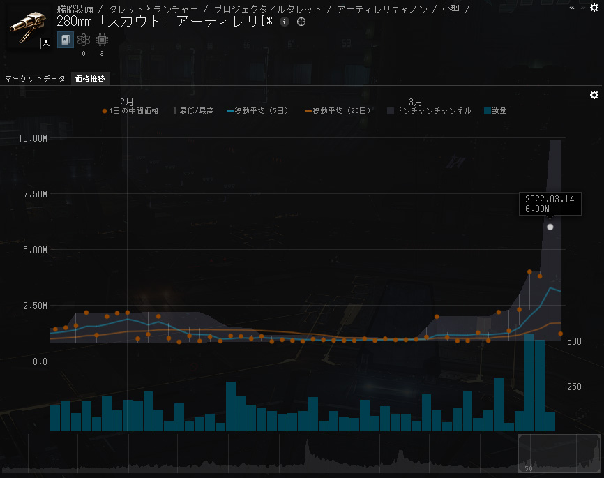 イベント 2022/03/15 ベンチャーFFA結果+マーケット値動き情報 2022/03/12~2022/03/14の48時間限定でベンチャーFFAが開催されたので、軽く走ってみました。結果は…… 23勝12敗1引分け(勝率63.8%) 15位でした!収益としては、戦闘およびマーケットで合計2.52b isk の黒字となりました。今回も記事本文でレギュレーション、メタFit、100位ボーダー、マーケット動向を備忘録として記載しておきます。 1.大会レギュレーション ※なんで日本語クライアントは翻訳されてないのCCP?(´・ω・`)【まとめると】・装備や薬はメタ4まで使用可能・リペアラは1個だけ装備可能・タレットのダメージ・射程・キャパシタ消費にボーナスが乗る・タレットやリペアラ等のヒート時にボーナスが乗る・ダンプ/兵器妨害/パージャー系は使用不可2.メタFit MWD+シールドバッファ+補助シールドブースター+長距離タレット(ビーム/レール/アーティレリ)・バッファを載せないとArtyの1ボレーでアーマーが削れるため、ほぼ必須。・リペアラが1個制限&タレットダメージにボーナスが乗るため、いかなるFitでもタンクは不可能。・Web/Scramが積みづらく、掴み合いの戦いではなく中距離での撃ち合いが主流となる。・ロック距離を拡張するためのリグを装備する人も多い。3.100位ボーダー FFAであることから回転数が少なく、またベンチャー限定という事もあり興味を持つ人が少なかったのか、100位ボーダーは7勝という低水準となりました。4.マーケット動向大会レギュレーションとメタFitの影響により、メタ4の長距離タレットが大幅値上がりしました。また、ベンチャーの短いロックレンジを補強するためのリグや、補助シールドブースターに使用する50海軍電池も値上がりしました。・メタ4小型ビーム (通常相場の4~5倍) ・メタ4小型アーティレリ (通常相場の5~9倍) ※メタタレットが1個9mでチャリンチャリンと売れていく音はとても健康に良い。・メタ3小型アーティレリ (通常相場の3~4倍) ・メタ4小型レール (通常相場の1.5~2倍) ・ロック距離拡張リグ (通常相場の3倍) ・50海軍電池 (通常相場の2~3倍) ・その他値上がりしたもの中型補助シールドブースター、ベンチャー船体、標準型ブルーピルなど◆おまけ:今回の収益今回は船代が約4m、ブースター代が約2m(事前の買い注文で安く仕入れたものだけを使用)、戦利品は1回あたり約40mでした。また、事前の仕入れによるマーケットPVPも並行して実施しました。・戦闘による収益支出:(4m*13損失)+(2m*6損失) = 64m ※poddingは2回に1回くらい収入:40m×23勝 = 920m・マーケットによる収益売上:1.9B仕入:約300m・合計2.52B isk の黒字アビサル期間中のマーケットはとても儲かりますね!本記事が皆様の金策/PLEX生活のお役に立てれば何よりです^^ PR